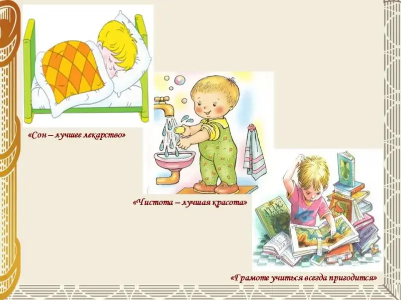 Так, например, на занятиях по ознакомлению с окружающим миром или формированию лексико-грамматических средств языка, когда мы знакомим детей с помещениями детского сада (группа, спальня, туалетная комната и т.п.) и занятиями, можно использовать такие пословицы как: «Чисто жить - здоровым быть», «Чистота - лучшая красота», «Не умывши лица, за стол не садись»; «Сон - лучшее лекарство», «Сон лучше всякого богатства», «После обеда полежи, после ужина походи»; Ученье - свет, а неученье тьма»; Ученье лучше богатства», «Грамоте учиться всегда пригодится». Чтобы дети лучше воспринимали специфику пословиц и поговорок как жанра устного народного творчества, при работе следует использовать иллюстрации.