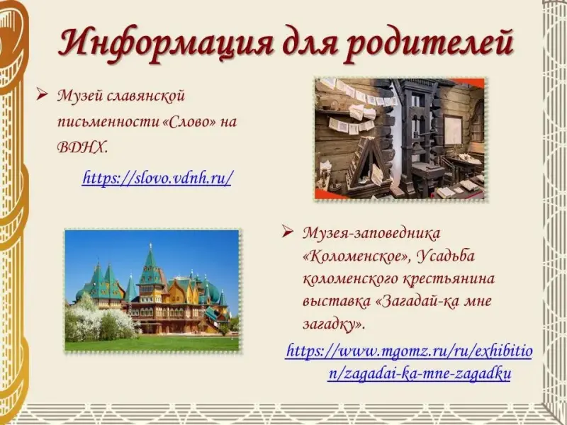 - Музей-заповедник «Коломенское», Усадьба коломенского крестьянина выставка «Загадай-ка мне загадку». Экспозиция посвящена устному народному творчеству в самом известном современному человеку проявлении - пословицах, поговорках и загадках: https://www.mgomz.ru/ru/exhibi…