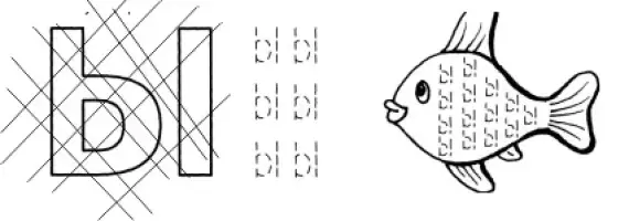 Несколько раз дети вместе с учителем "пишут" букву в воздухе. Затем учитель ставит образец следующего задания на доску. У детей задание напечатано на рабочих листках. Ребята учатся писать букву простым карандашом 3 движениями по пунктирным линиям. Дети обводят букву на листочках, под красиво написанной буквой ставят точку. Если ребёнок сделает задание быстрее других, ему предлагается дополнительное задание из листочка (найти и обвести все "ы" на рыбке или задание №4 (см. приложение)).