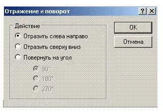 -В графическом редакторе Paint можно отражать фрагмент рисунка относительно вертикальной или горизонтальной оси симметрии выделяющего прямоугольника. Для этого выделяем рисунок и выполняем команду Рисунок - Отражение и поворот. Появится окно данного вида: <Рисунок 1>