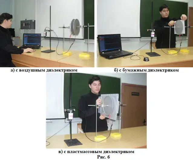 - В пространство между пластинами конденсатора сначала внести бумажные листы, затем пластмассовую пластину. В каждом случае измерить перераспределённый заряд на пластинах конденсатора (рис. 6).