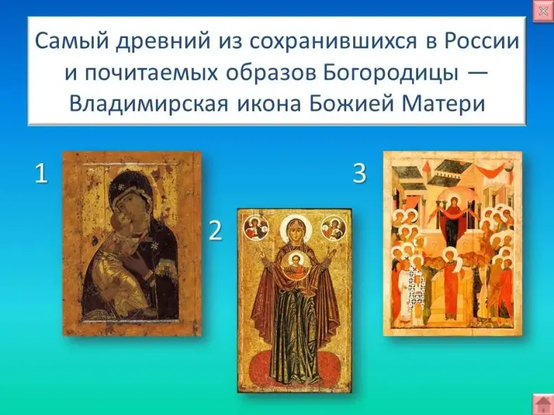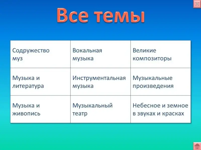 - Переход к списку тем (номинаций) каждого раунда викторины происходит при помощи кнопки «Домой», расположенной в нижнем правом углу слайдов.