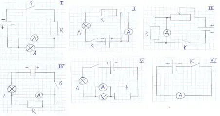 Учитель физики: С помощью данного задания мы проверим, как вы усвоили некоторые правила и законы, связанные с электрическими явлениями (на партах лежат карточки с электрическими схемами).