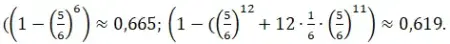 поинтересовался мнением сэра Исаака Ньютона, что вероятнее: хотя бы одна шестёрка при бросании шести игральных костей или хотя бы две шестёрки при бросании 12 костей? Запишите для обоих случаев