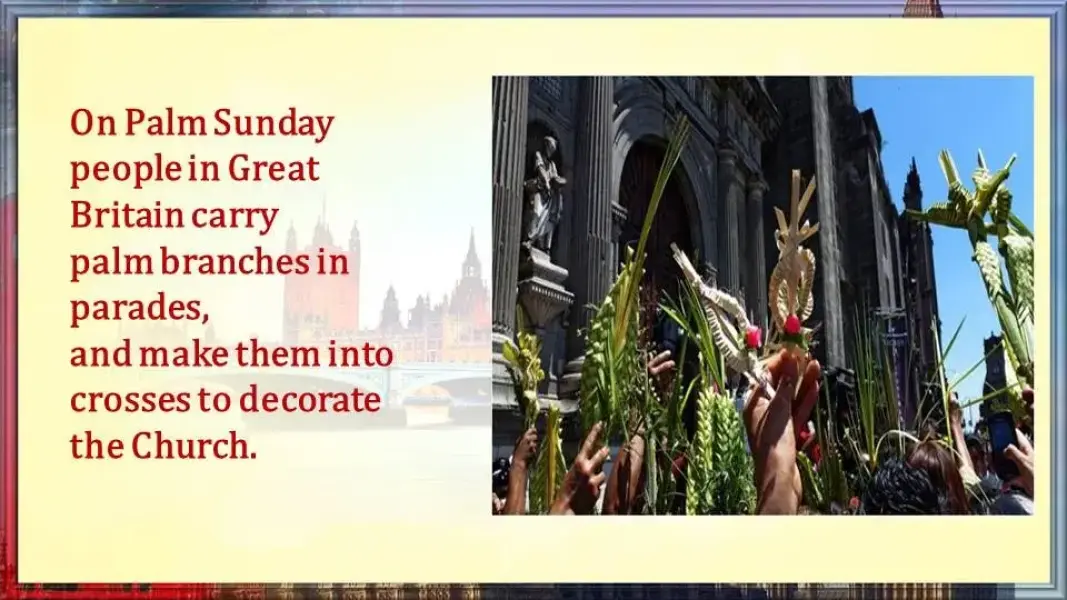 Слайд 9: People in Great Britain carry palm branches in parades, and make them into crosses to decorate the Church.