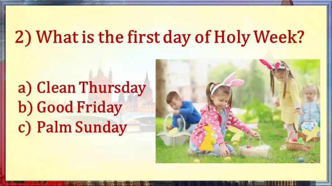 Слайд 8: Holy Week before Easter begins with Palm Sunday. It marks the end of Lent and celebrates Jesus' triumphal entry into Jerusalem.