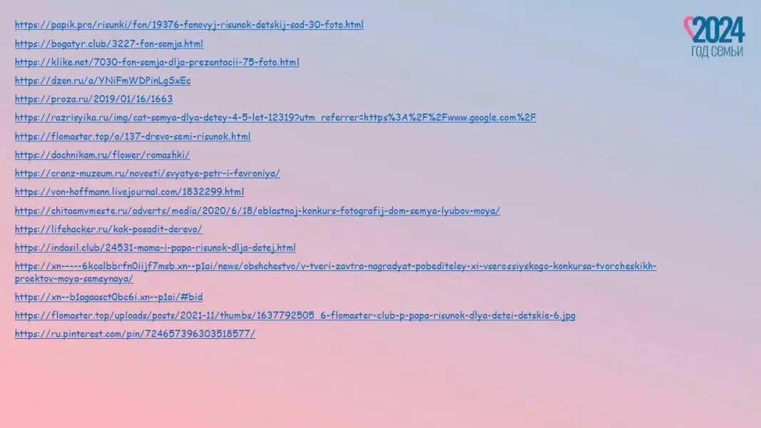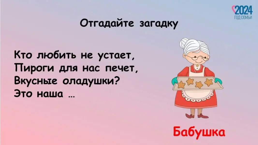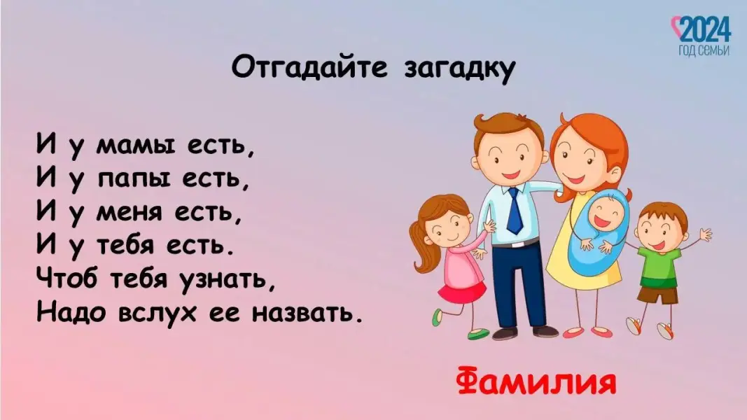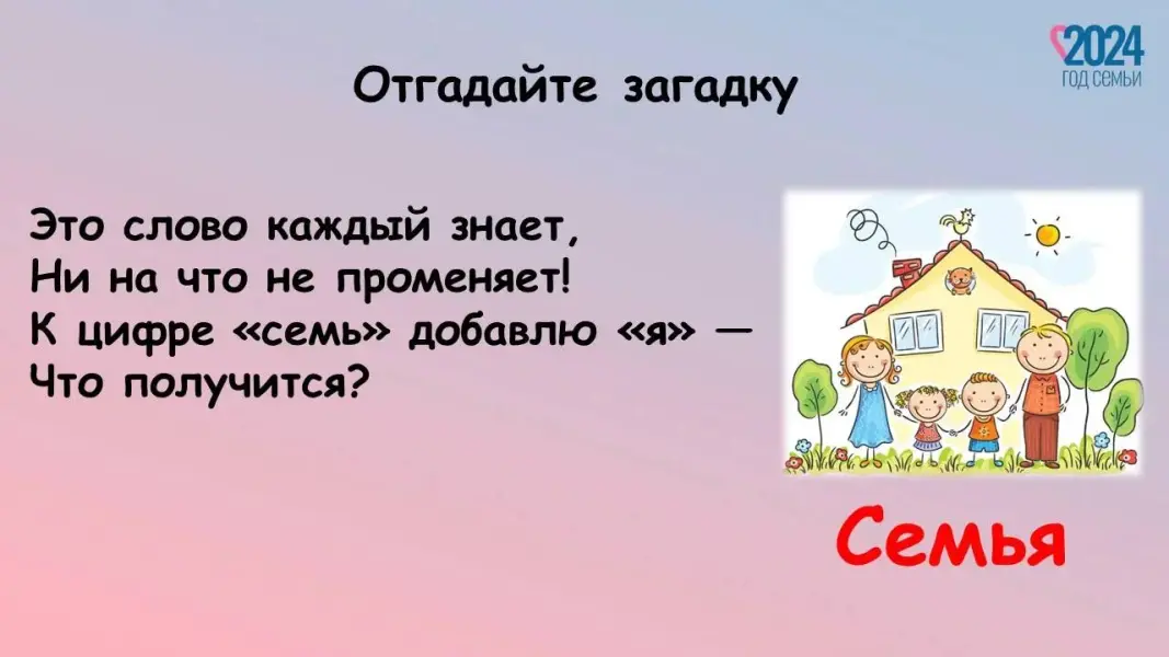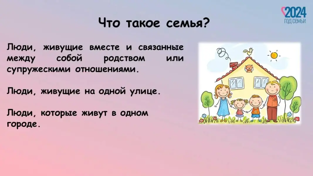 Педагог: 2024 год объявлен в России Годом семьи. Семья - это дом, это папа и мама, бабушка и дедушка. Это те люди, с которыми всегда рядом очень тепло и уютно. В каждой семье свои ценности и традиции, которые помогают сохранить любовь, уважение. Ребята, в течение нескольких недель мы с вами говорили о значении семьи в нашей жизни (реализация проекта «По страницам семейного альбома»). Ваши мамы и папы помогали нам с вами провести занятия. Дома с родителями вы изучали свою родословную, узнали больше о профессии родителей. Вы создали свой альбом, в котором есть самая важная информация о вашей семье. У нас сегодня есть возможность полистать страницы ваших семейных альбомов.