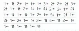 Теперь самое время отпраздновать твой успех! Праздник это всегда музыка и танцы. Мы тоже потанцуем. Будем отстукивать ритм под музыку, соблюдая символы на ритмодорожке. Чтобы пройти по дорожке нужно внимательно смотреть какие символы на ней изображены. Два круга - два стука, три круга - три стука. Выполняем упражнение деревянными палочками (выполнение упражнения под музыку Раз, два, три! Солдатом стать умелым).