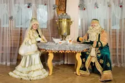 Детей поздравляют с праздником татарский Дед Мороз Кыш-Бабай и его внучка Кар-Казы.