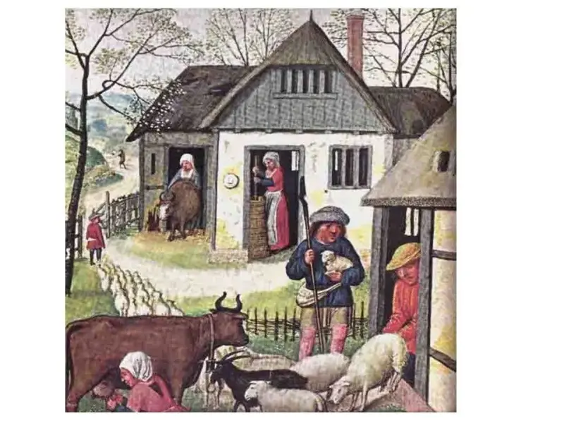 - Впереди видны поля. С одной стороны поля господина, с другой - крестьянские наделы. Так, пахотная и прочая земля в поместье делилась на две части: господскую и крестьянские наделы.