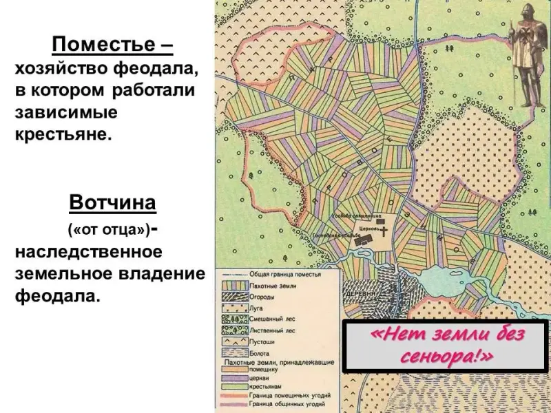 - В средние века действовало правило: «Нет земли без сеньора» (господина). К IX-X вв. вся земля в Западной Европе оказалась у феодалов. (СЛАЙД 8). Записываем в словаре, что такое поместье.