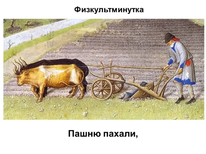 - А нам пора домой возвращаться в век XXI. По дороге домой мимо крестьянских полей, где как раз сейчас работают крестьяне, еще раз обратите внимание на их тяжелый труд, орудия труда.