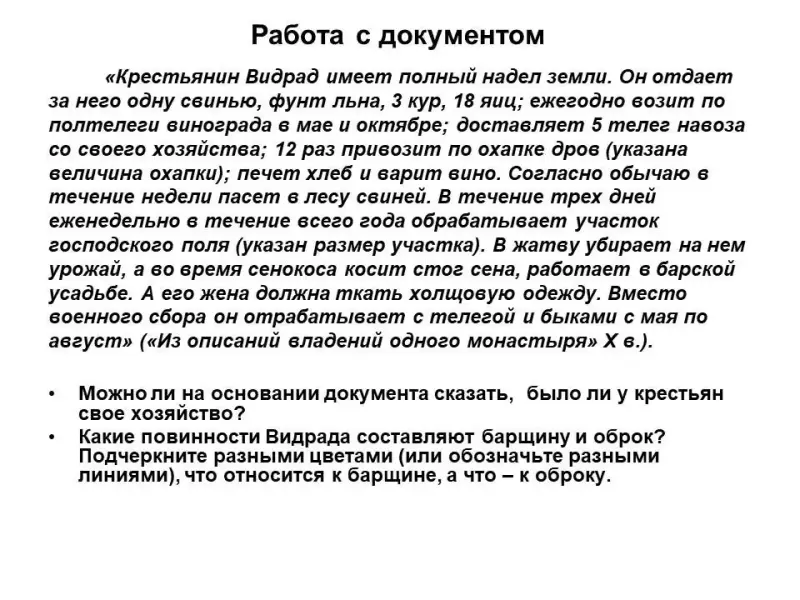 «Крестьянин Видрад имеет полный надел земли. Он отдает за него одну свинью, фунт льна, 3 кур, 18 яиц; ежегодно возит по полтелеги винограда в мае и октябре; доставляет 5 телег навоза со своего хозяйства; 12 раз привозит по охапке дров (указана величина охапки); печет хлеб и варит вино. Согласно обычаю в течение недели пасет в лесу свиней. В течение трех дней еженедельно в течение всего года обрабатывает участок господского поля (указан размер участка). В жатву убирает на нем урожай, а во время сенокоса косит стог сена, работает в барской усадьбе. А его жена должна ткать холщовую одежду. Вместо военного сбора он отрабатывает с телегой и быками с мая по август» («Из описаний владений одного монастыря» X в.).