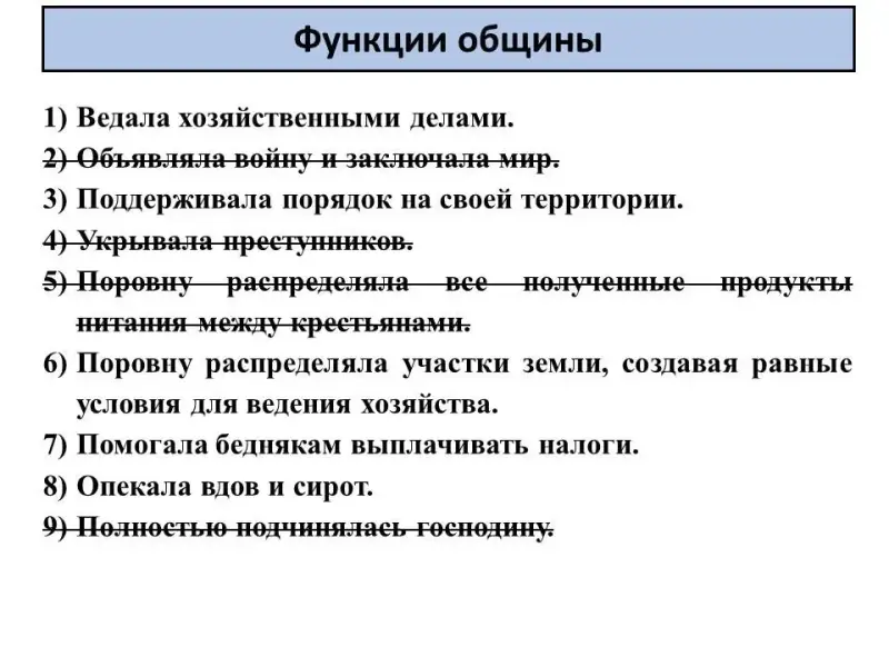 - Из перечисленного ниже списка вычеркните те пункты, которые не являются функциями общины (или исправьте их).
