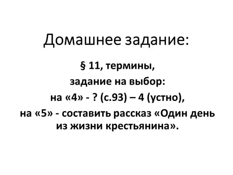 - на «5» - составить рассказ «Один день из жизни крестьян.