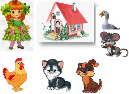 На столе игрушки зверей, птиц. В гости идут гусь, курица, кошка, собака, мышка.