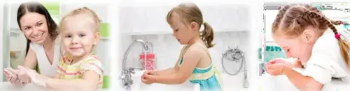«Идем умываться. Открывай кран. Бери мыло. Намыль руки. Как много пены. Растирай пену. Три сильнее. Смывай мыло. А теперь вымоем лицо. Какое чистое, розовое личико, какие чистые руки».