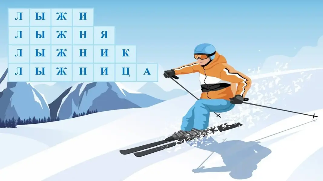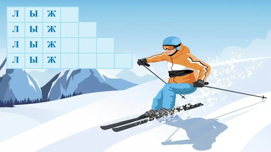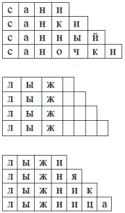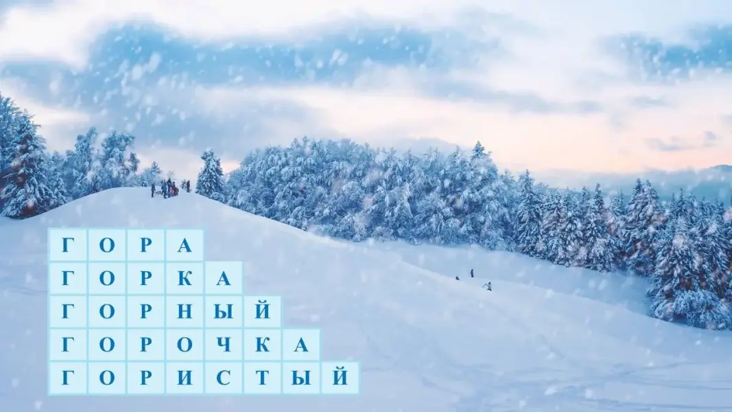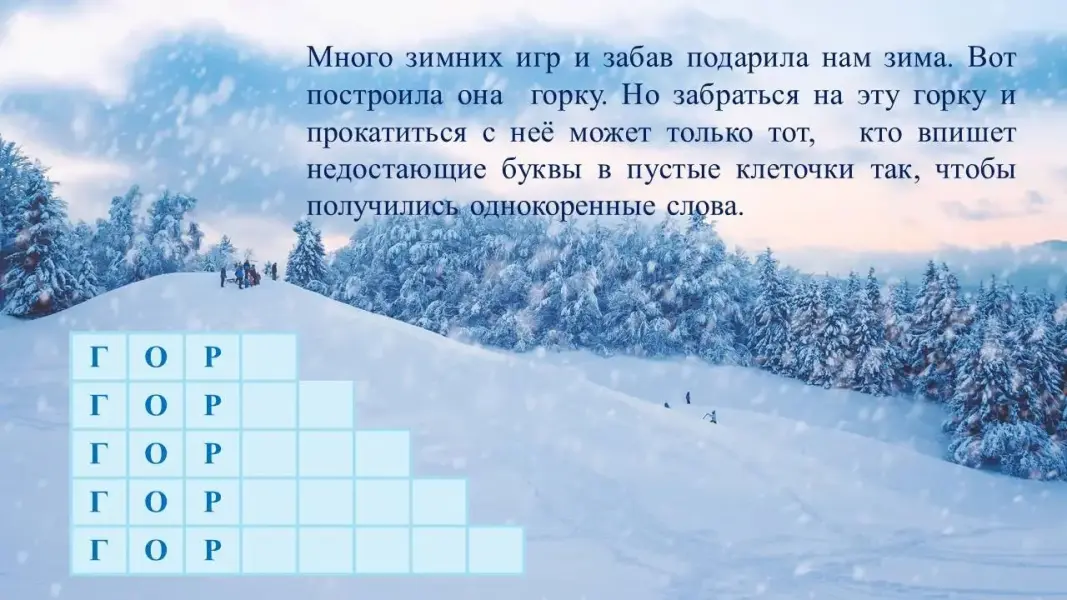Логопед: - Ребята, вы знаете, что много зимних игр и забав подарила нам зима. Вот построила она горку. Но забраться на эту горку и прокатиться с неё может только тот, кто впишет недостающие буквы в пустые клеточки, чтобы получились однокоренные слова.