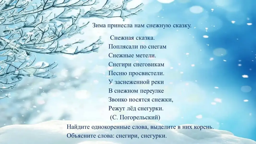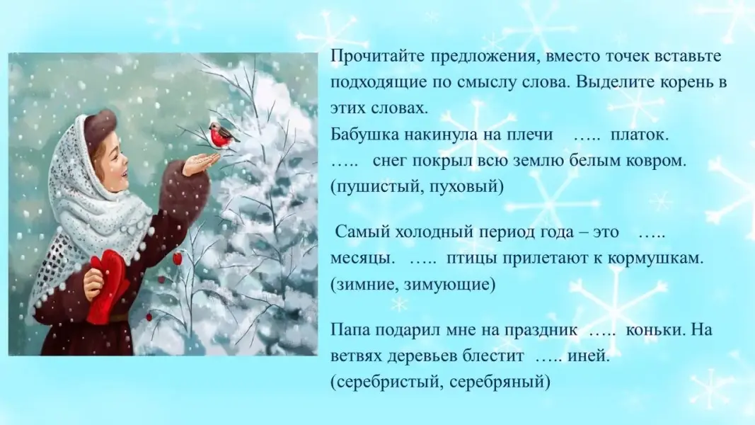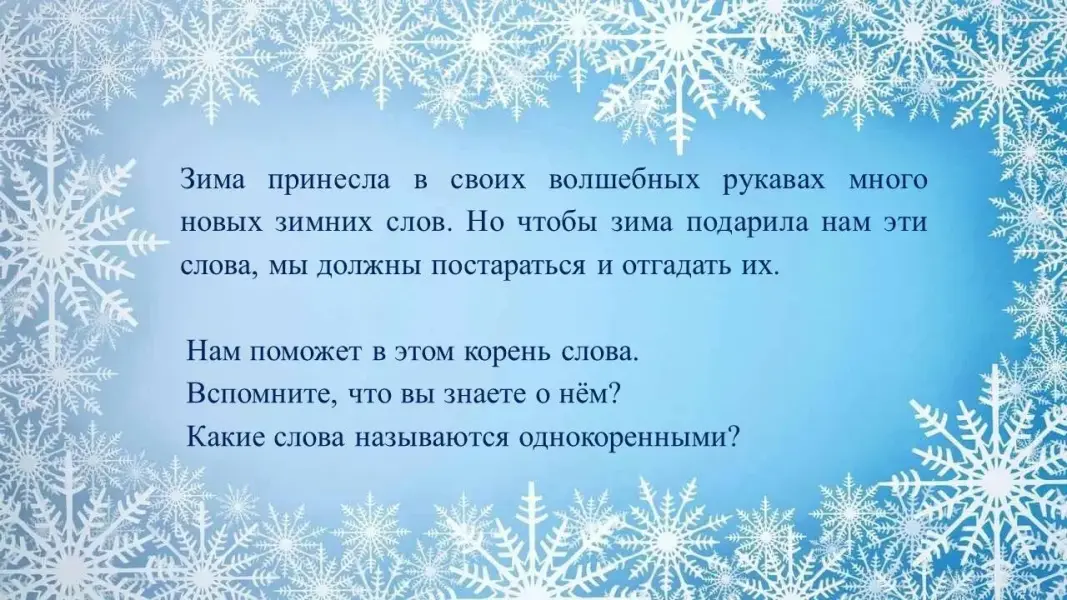 Цель: закрепление знаний по теме «Однокоренные слова» на материале лексической темы «Зима».