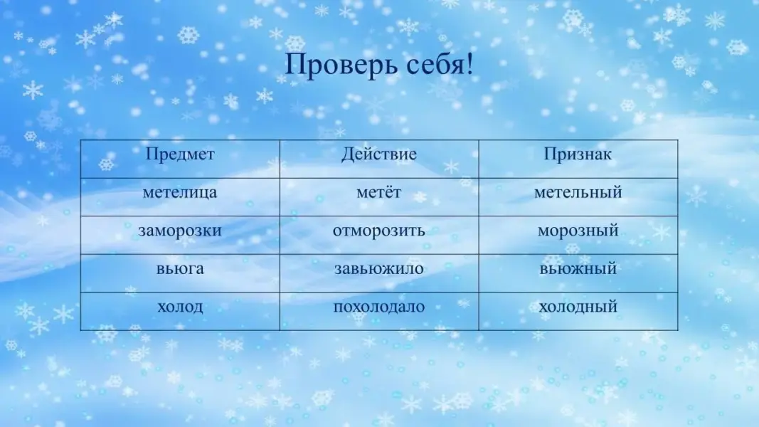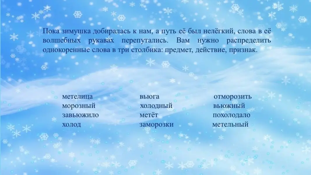 Логопед: - Ребята, пока зимушка добиралась к нам, а путь её был нелёгкий, слова в её волшебных рукавах перепутались. Вам нужно распределить однокоренные слова в три столбика: предмет, действие, признак.