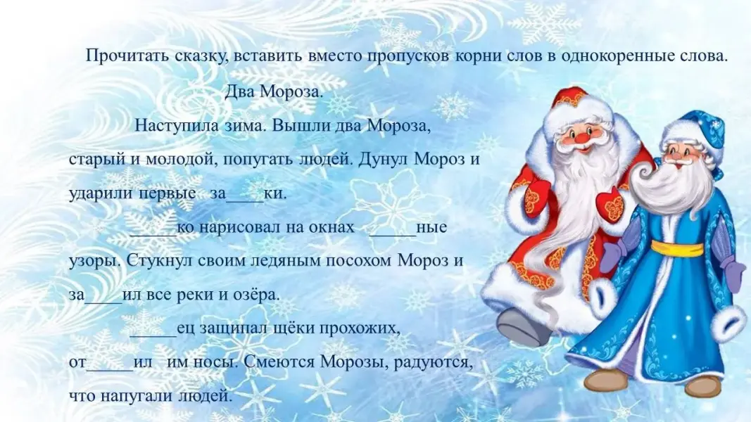Дети должны догадаться, что пропущен корень слова мороз. Учащиеся читают текст и вставляют корень слова мороз.
