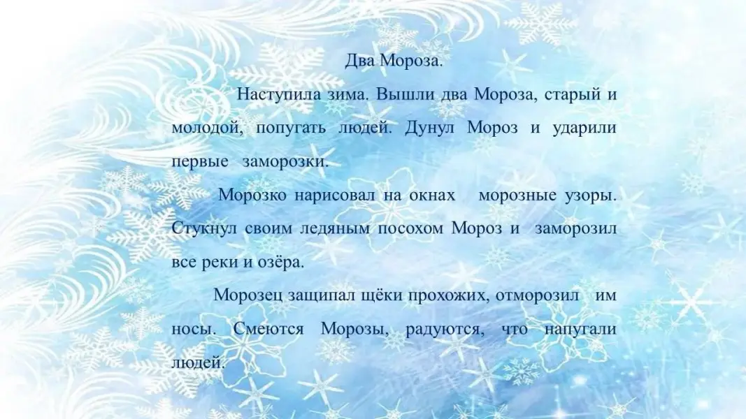 Наступила зима. Вышли два Мороза, старый и молодой, попугать людей. Дунул Мороз и ударили первые заморозки. Морозко нарисовал на окнах морозные узоры. Стукнул своим ледяным посохом Мороз и заморозил все реки и озёра. Морозец защипал щёки прохожих, отморозил им носы. Смеются Морозы, радуются, что напугали людей.