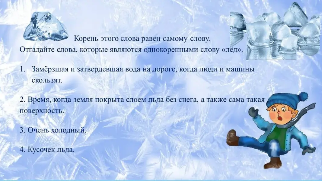 Корень этого слова равен самому слову. Отгадайте слова, которые являются однокоренными слову «лёд».