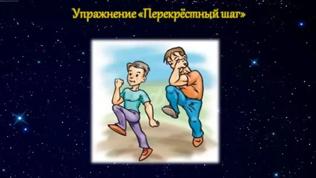 2. Кинезиологическое упражнение «Перекрёстный шаг» (активизирует работу обоих полушарий, подготавливает к усвоению знаний).