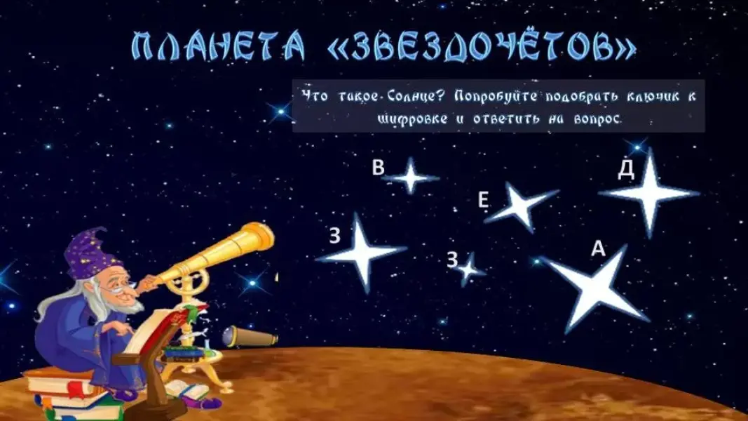 - Мы на планете Звездочётов. Солнечная система получила своё название в честь Солнца. А что такое Солнце? Попробуйте подобрать ключик к шифровке и ответить на вопрос. (Дети выполняют задание в тетради).