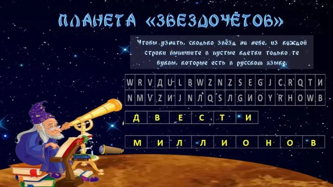 - Вспомните один из ясных вечеров, когда небо было усыпано крошечными светлячками. Это звёзды. Они кажутся нам маленькими, потому что находятся очень далеко от Земли. На самом деле, звёзды - огромные раскаленные шары, состоящие из газа. Солнце - это тоже звезда, самая близкая к нам. Издавна звездочёты (сейчас их называют «астрономы») пытались сосчитать, сколько всего звёзд на небе. Давайте и мы узнаем, сколько звёзд на небе. Для этого из каждой строки выпишите в пустые клетки только те буквы, которые есть в русском языке. (Дети выполняют задание в тетради).