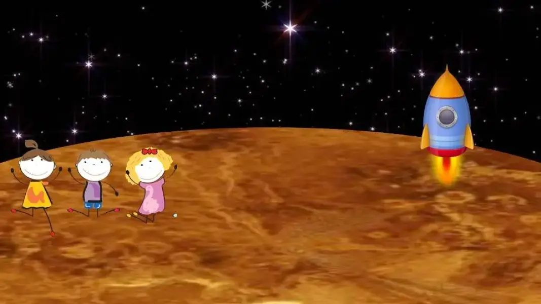 - А мы продолжаем полёт, и наша ракета устремляется к планете Солнечная Семейка. Здесь мы узнаем о Солнечной системе. Это родной дом нашей планеты Земля. У звезды под названием Солнце есть большая и дружная семейка: 8 детишек разного возраста. Это планеты Солнечной системы. Они расположены в таком порядке от Солнца: Меркурий, Венера, Земля, Марс, Юпитер, Сатурн, Уран, Нептун. Все они вращаются вокруг Солнца.