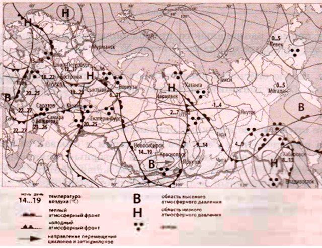 3. Карта погоды составлена на 29 августа 2019 года. В каком из перечисленных населённых пунктов, показанных на карте, на следующий день наиболее вероятно существенное потепление?