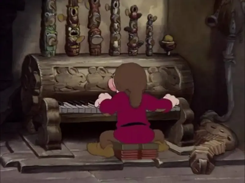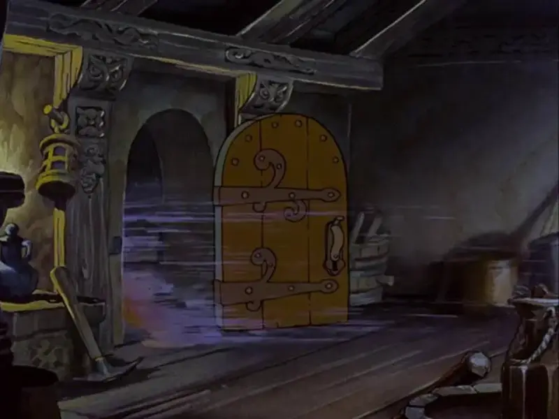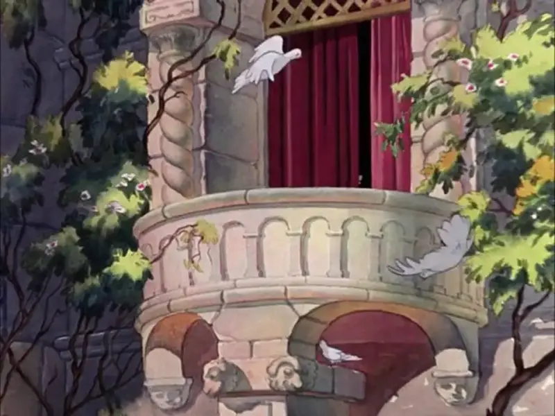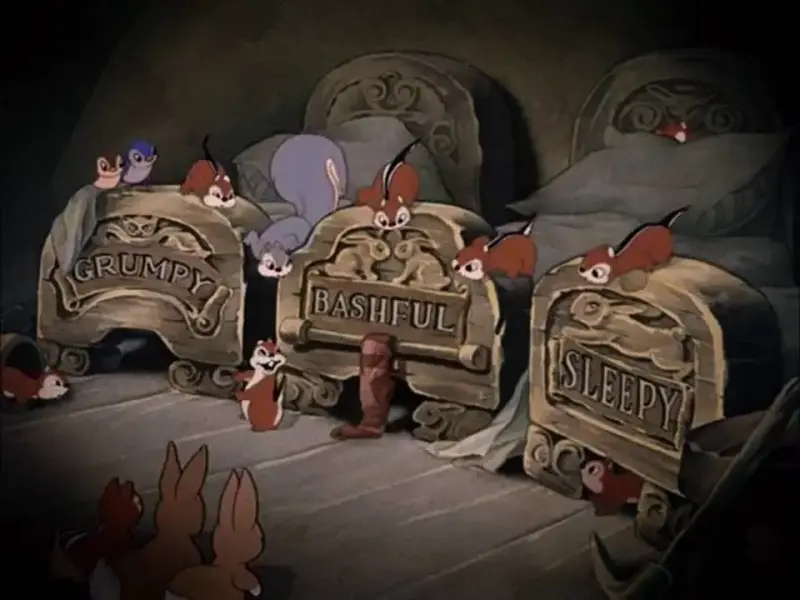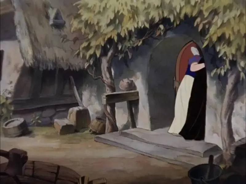 Snow White: Oh! It's adorable! Just like a doll's house! I like it here. (Заглядывает в воображаемое окно) Ooh! It's dark inside! Is there anybody home? Hello? May I come in? (Заходит в дом)