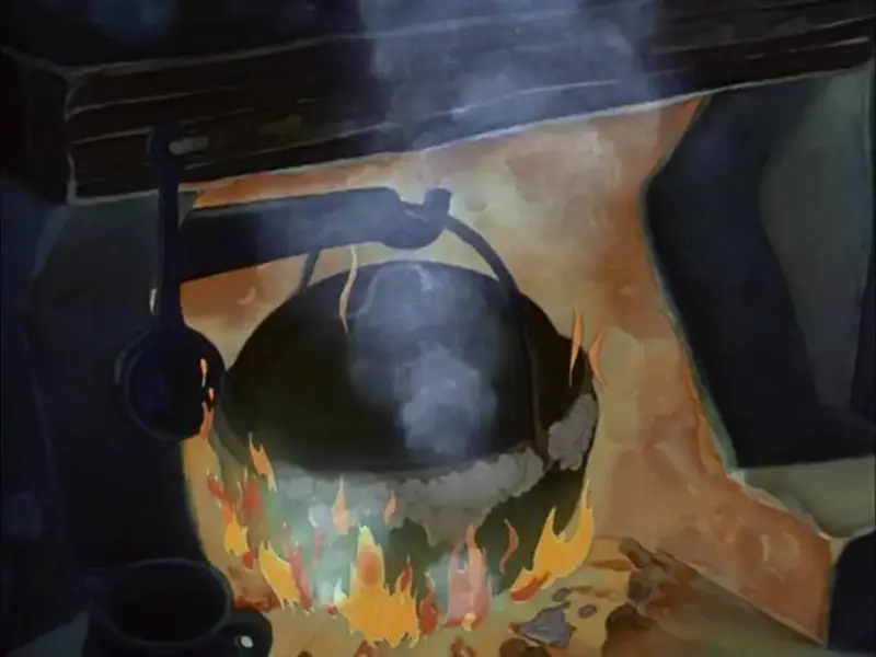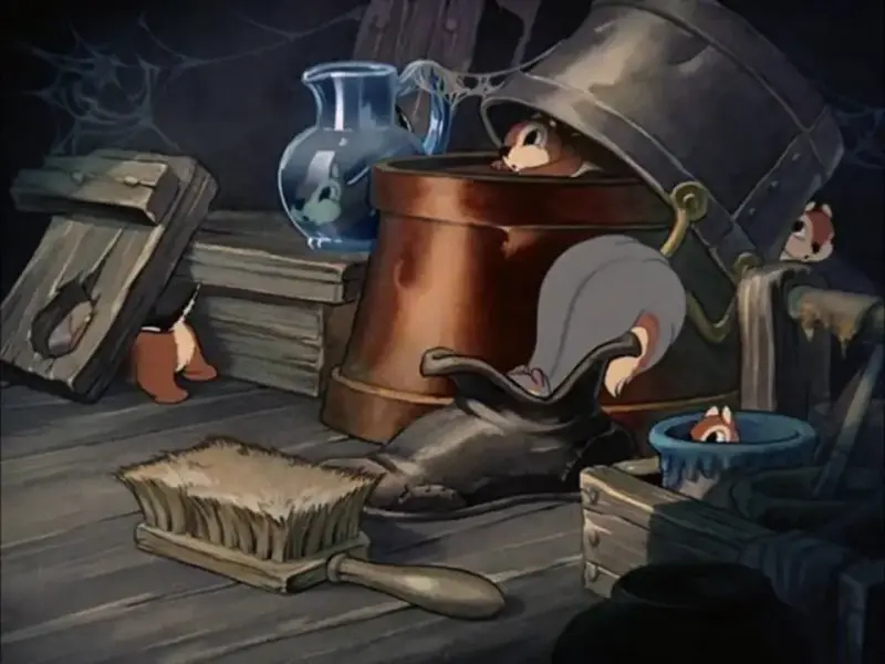 (Осматривается, садится на стул) What a cute little chair! Why, there're little chairs! What a pile of dirty dishes! I know! I'll clean the house! Then maybe they'll let me stay. Now, I wash the dishes, tidy the room. I clean the fireplace and I will use the broom. Убирает комнату и заходит в спальню.