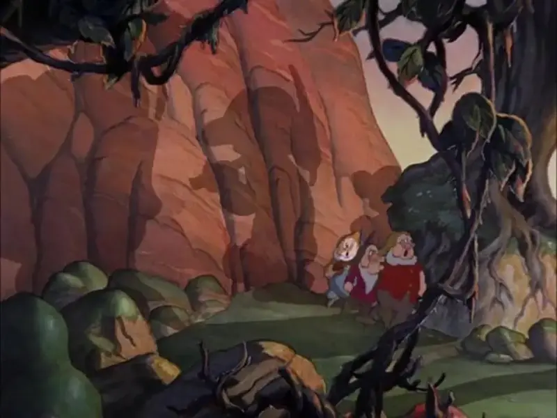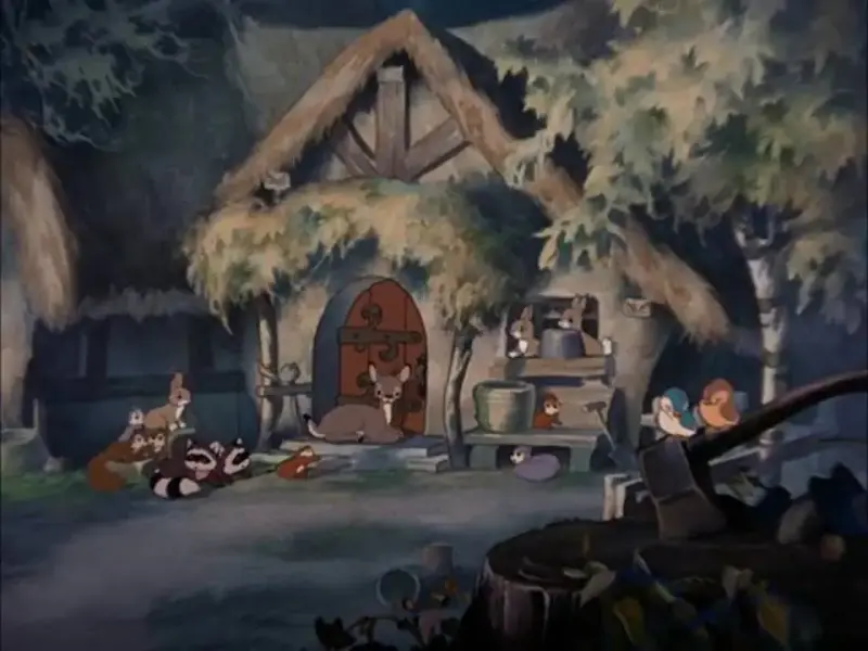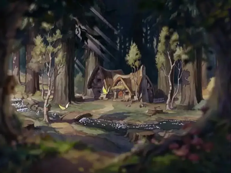 Белоснежка бежит по лесу. Страшные звуки. Наконец она выбегает на полянку. И видит домик гномов.
