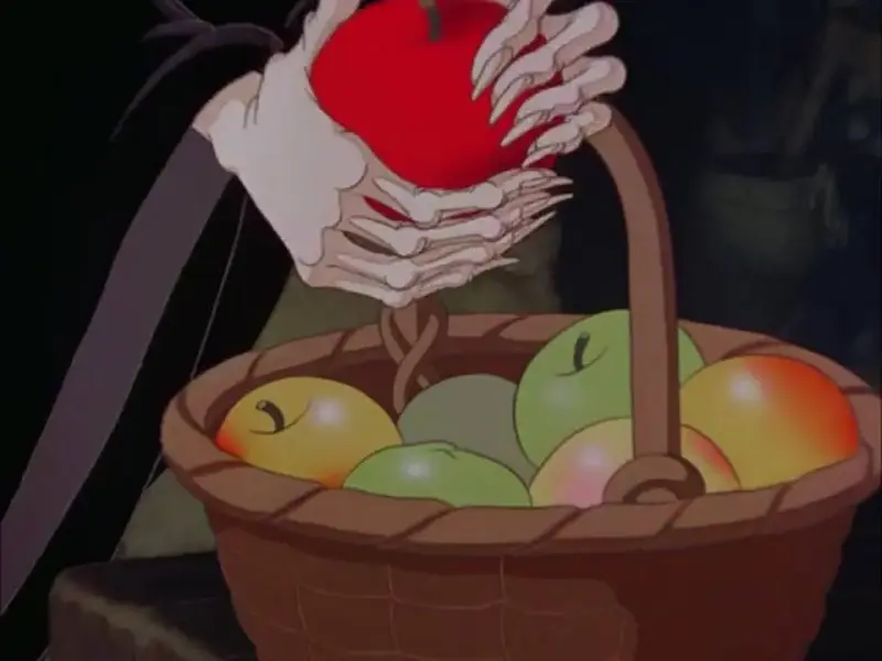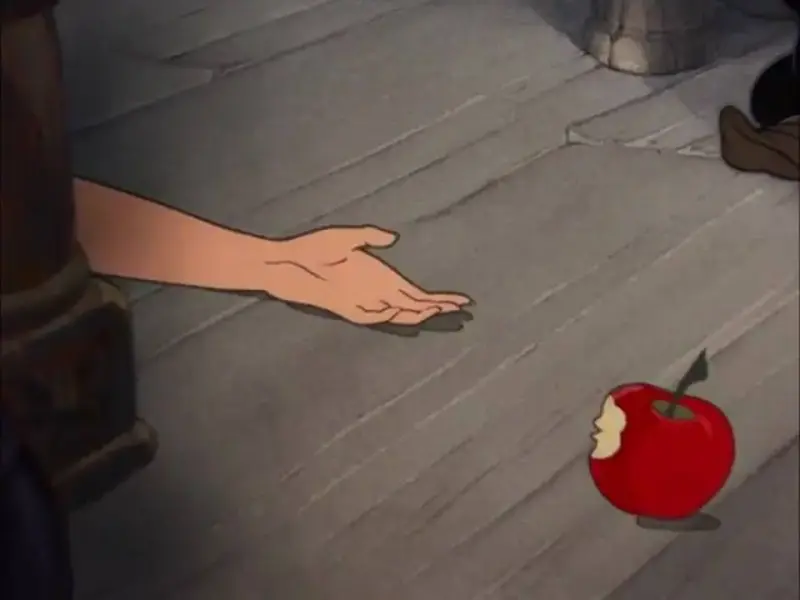 Queen: The heart is of a pig. I've been tricked. I'll go myself to the dwarfs' cottage. A poisoned apple. Sleeping death. Берет яблоко. It's for Snow White. When she tastes the apple, her breath will still, her blood congeal. Then I'll be the fairest in the land! Sleeping death can be revived only by love's first kiss.
