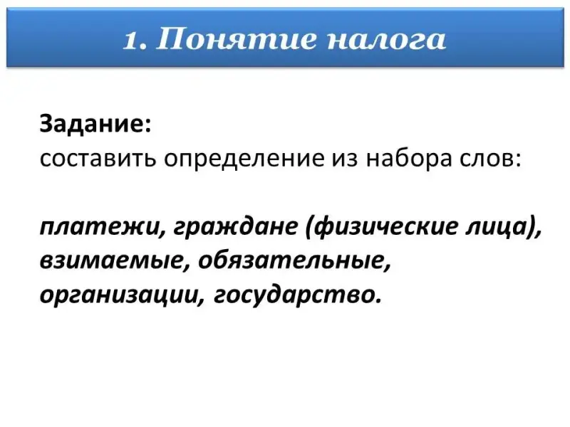 Задание: составить определение из набора слов: платежи, граждане (физические лица), взимаемые, обязательные, организации, государство.