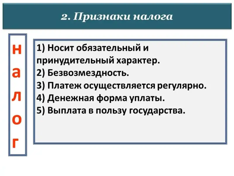 - В слове «налог» 5 букв, и основных признаков у него тоже пять (записывают в тетради).