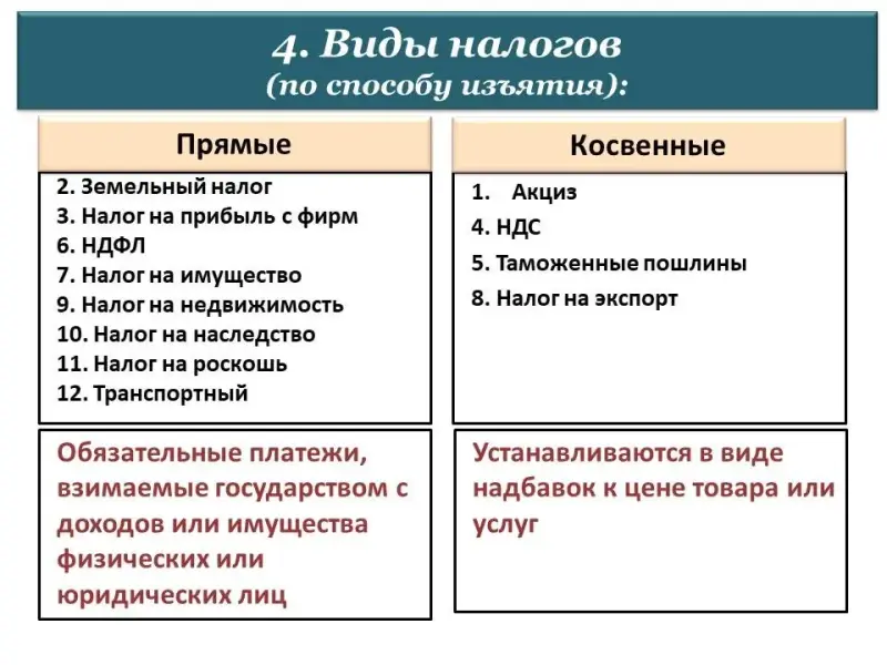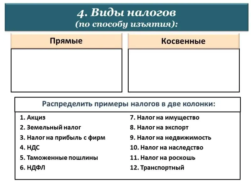 5.2. Задание 1: Вспомнить основные виды налогов по способу изъятия. Ознакомить с некоторыми видами налогов.