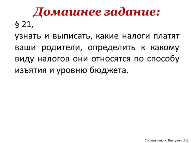 § 21 (электронное учебное пособие), узнать и выписать, какие налоги платят ваши родители, определить к какому виду налогов они относятся по способу изъятия и уровню бюджета.