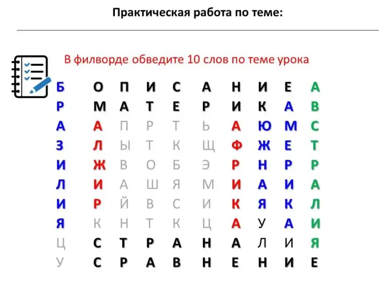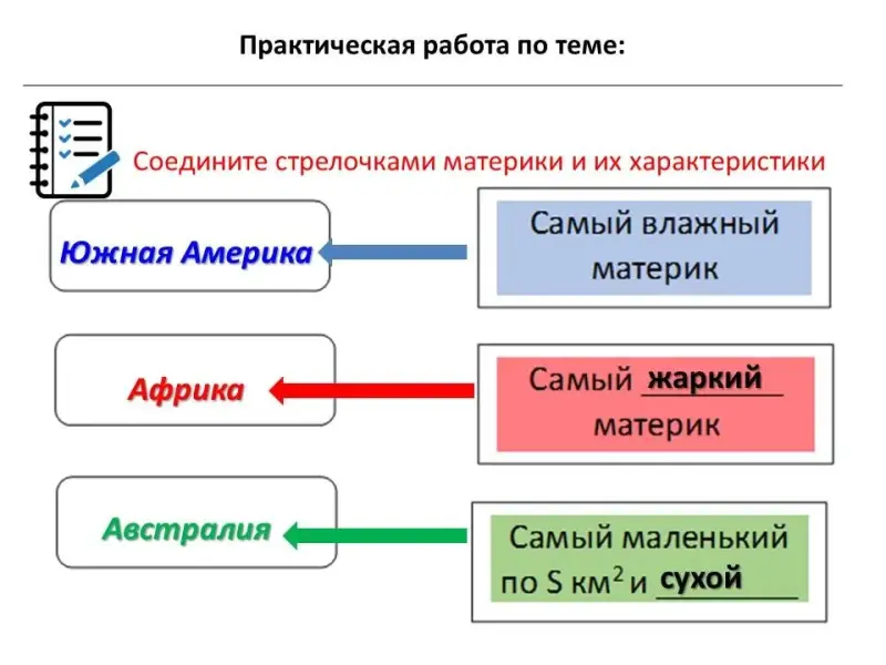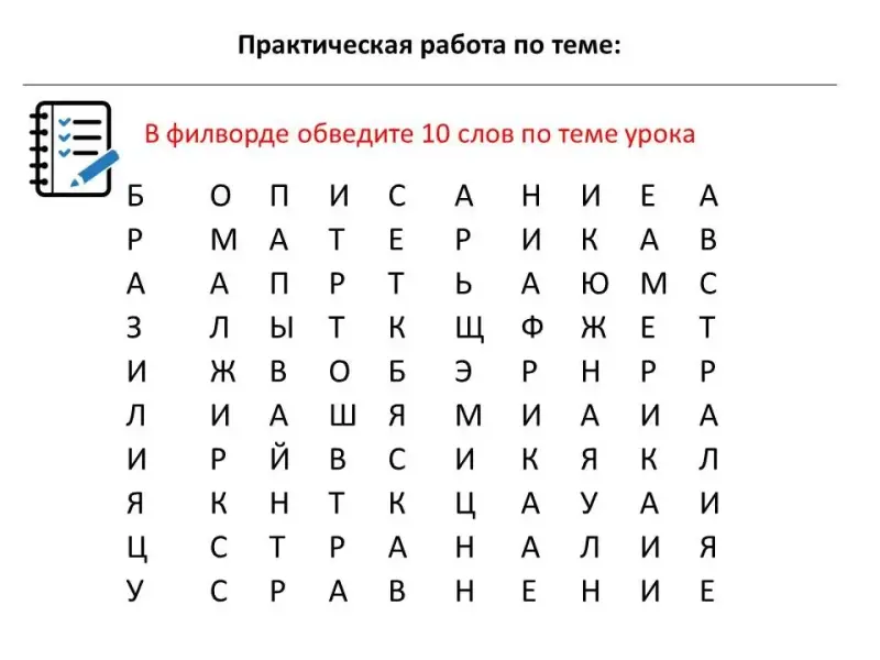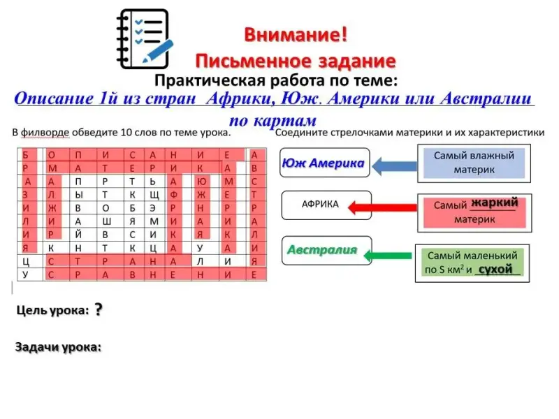 В филворде обведите 10 слов по теме урока. Соедините стрелочками материки и их характеристики (работа по рабочему листу)