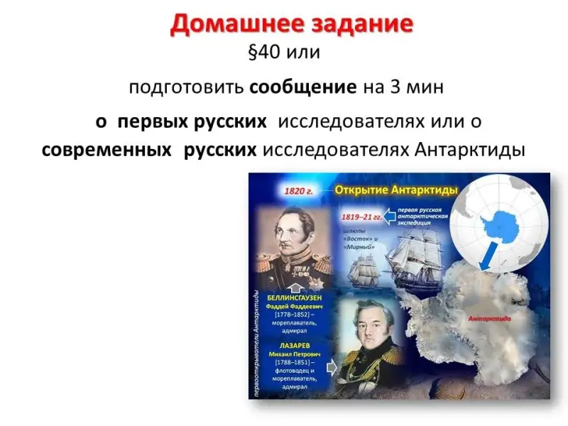 §40 или подготовить сообщение на 3 мин: о первых русских исследователях или о современных русских исследователях Антарктиды. (слайд 20)