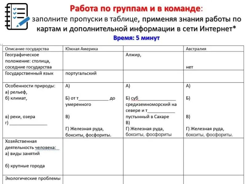 - Заполните пропуски в таблице, применяя знания работы по картам и дополнительной информации в сети Интернет*. Распределите между собой в группе пункты для быстрого поиска и обмена информации. (слайд 22-25)