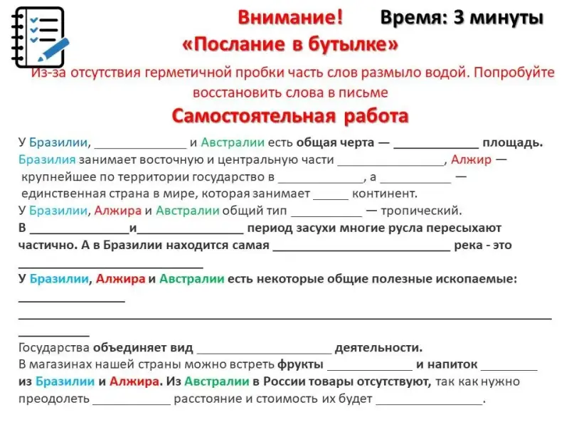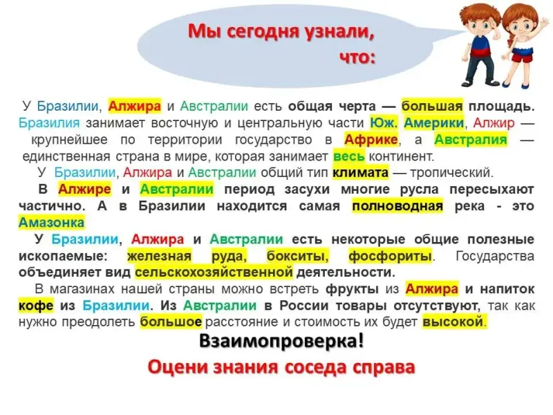 Вопрос для закрепления темы урока «дополни фразу»: сегодня на уроке …. научились характеризовать страны и делать общий вывод по ним.