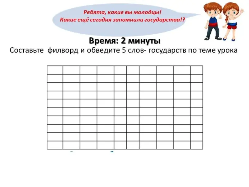 Филворд - учащиеся составляют и обводят 5 слов - государств по теме урока, свободные клеточки заполняют любыми буквами.