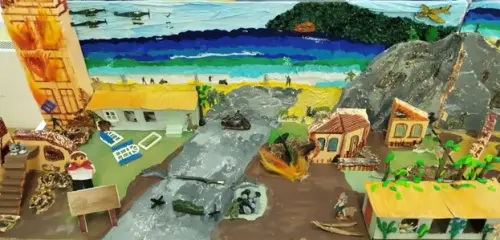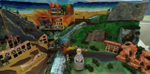 На макете дом Вити, море, рисунок и вдруг - сирена. Бомбежка. Разрушенные здания. В небе вражеские самолеты. Детский рисунок сменяется огнем войны. Зрители слышат рассказ дедушки (записанный на аудио), видят макет и история оживает прямо перед глазами.