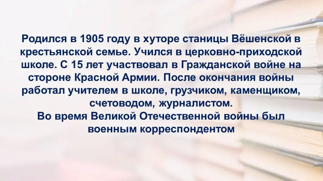 Родился в 1905 году в хуторе станицы Вёшенской в Крестьянской семье. Учился в церковно-приходской школе. С 15 лет участвовал в Гражданской войне на стороне Красной Армии. После окончания войны работал учителем в школе, грузчиком, каменщиком, счетоводом, журналистом. Во время Великой Отечественной войны был военным корреспондентом (Слайд 15. М.А.Шолохов)