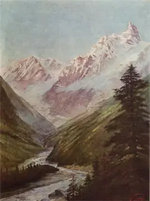 Утреннее восходящее солнце играет на вершинах снежных гор. Внизу, в глубоком ущелье, окутанном лёгким туманом, изгибается река, берега которой покрыты огромными соснами. К.Хетагуров умел передать могущество кавказской природы.