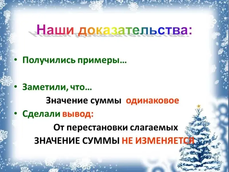 - Сделали вывод: (от перестановки слагаемых значение суммы не изменяется)