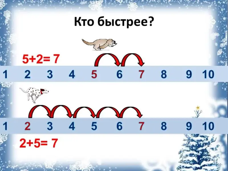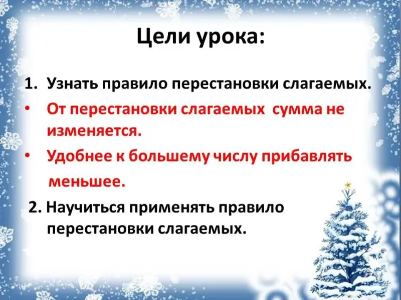 - Образовательные: Ознакомление с законом перестановки слагаемых, формирование умения применять закон о перестановке слагаемых при вычислениях.